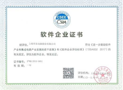 2019Äê6Ô£¬ÉϺ£»ª¶«µçÄԹɷÝÓÐÏÞ¹«Ë¾ÔÙ´Î˳Ëìͨ¹ýÉϺ£ÊÐÈí¼þÐÐҵлáµÄÑÏ¿áÉóºË£¬Çкϡ¶½øÒ»²½ÃãÀøÈí¼þ¹¤ÒµºÍ¼¯³Éµç·¹¤ÒµÉú³¤µÄÈô¸ÉÕþ²ß¡·ºÍ¡¶Èí¼þÆóÒµÆÀ¹À±ê×¼¡·µÄÓйػ®¶¨£¬±»È϶¨ÎªÈí¼þÆóÒµ£¬»ñµÃ¡°Èí¼þÆóÒµÖ¤Ê顱¡£